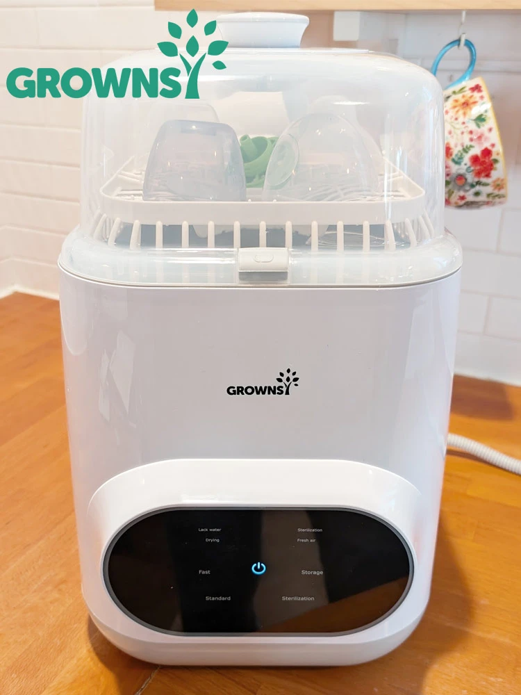 The Grownsy Bottle Washer Pro is a true all-in-one station for washing, sterilizing, drying, and storing bottles and accessories. It uses 26 spray jets and a double-layer rack that holds up to four bottles plus parts, with customizable wash, sterilize, and 72-hour storage modes. In our testing, it cleaned thoroughly, achieved 99.99% germ-kill, dried bottles extremely well, and remained quiet, leak-free, and easy to operate thanks to intuitive controls, a HEPA filter, countdown timer, and drain hose. The 55-minute dry cycle is on the longer side, but its performance and feature set make it a standout convenience upgrade.